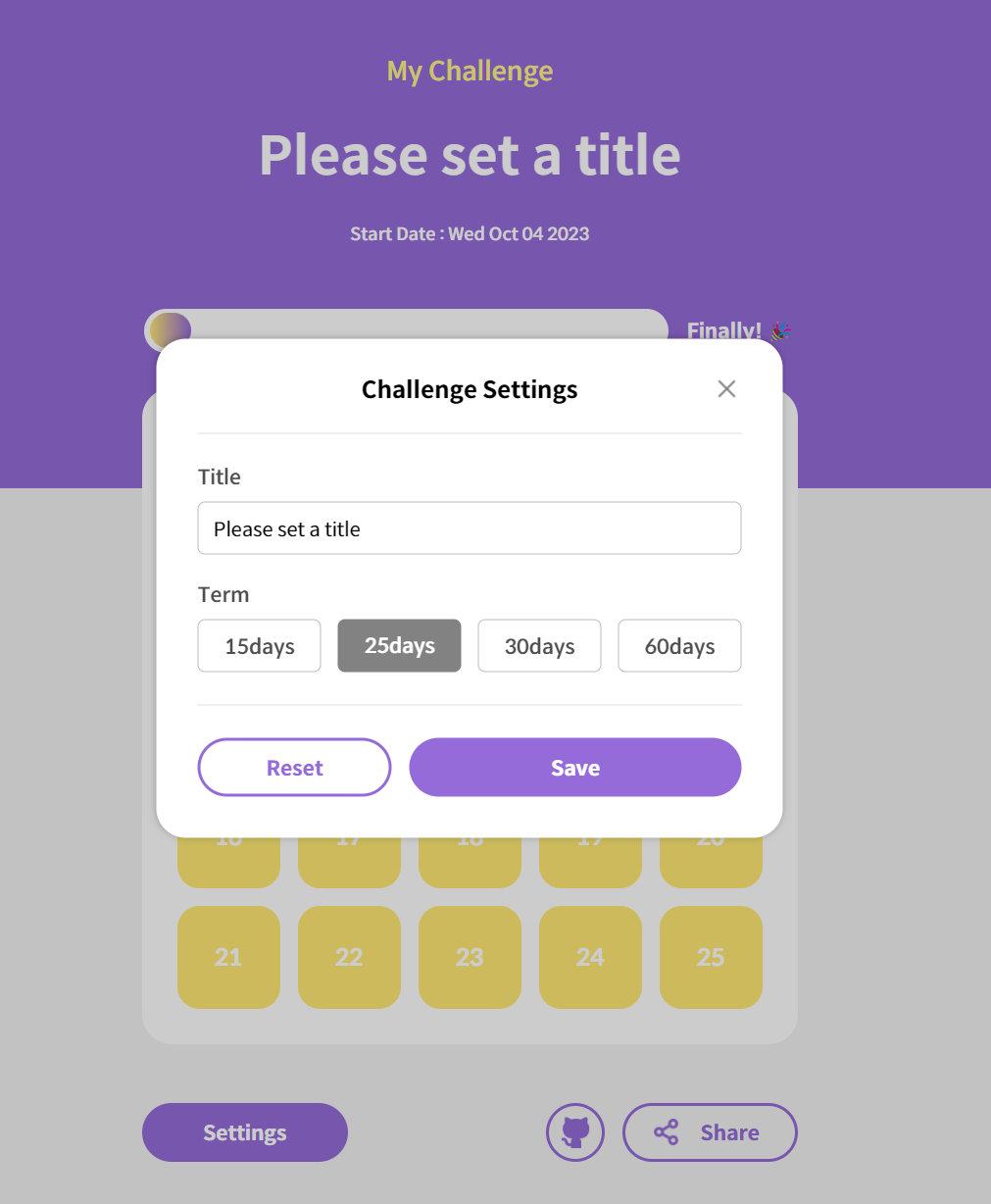이렇게 settings를 누르면, 날짜와 챌린지 제목을 정할 수 있다.